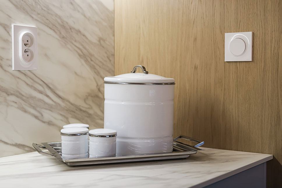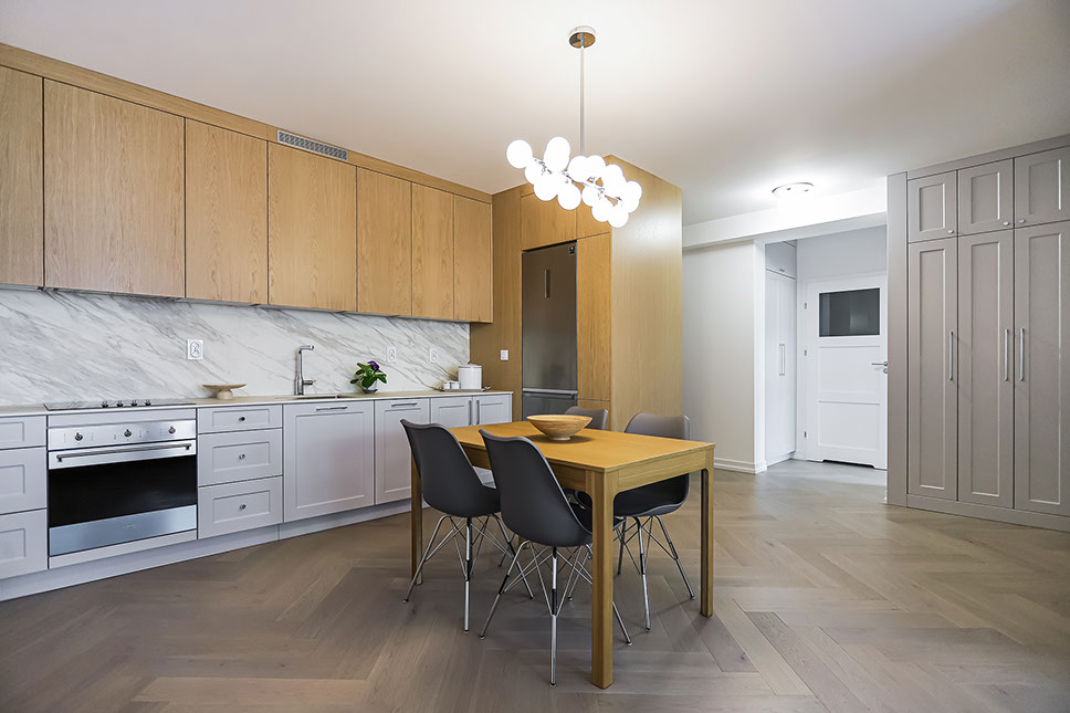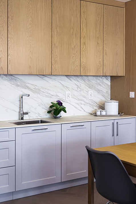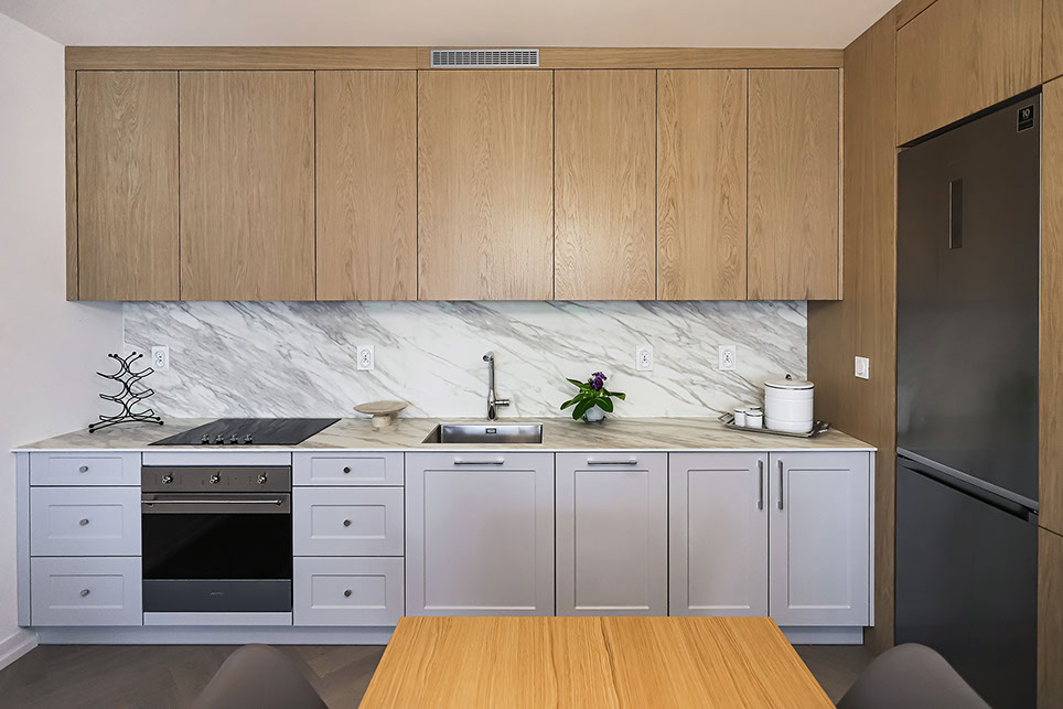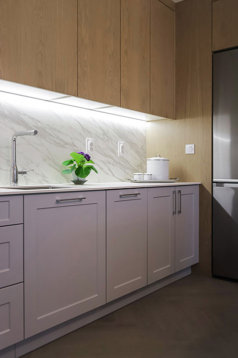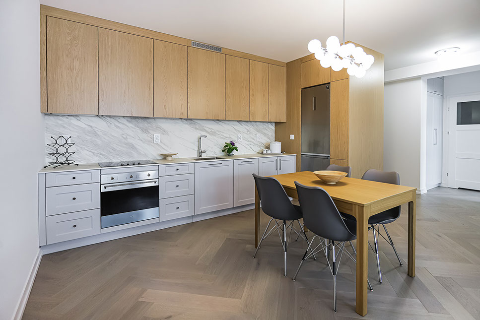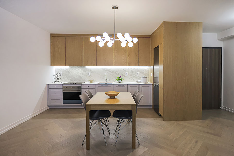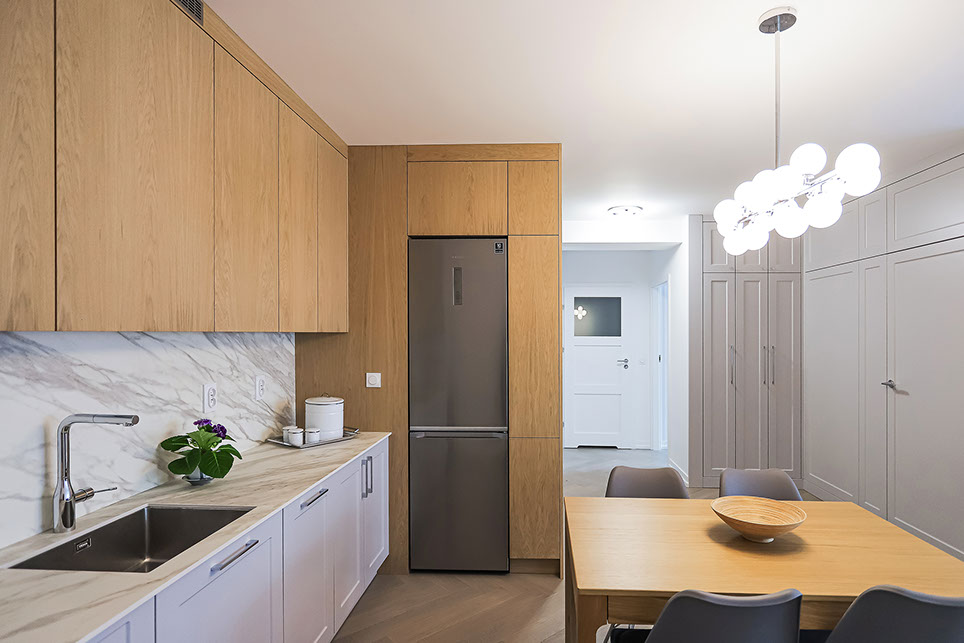 Aby osiągnąć zamierzone efekty zastosowano niecodzienne rozwiązania. Zabudowa lodówki jest jednocześnie szafą w przedpokoju. Zaś zabudowa przedpokoju to jednocześnie ścianka działowa wydzielająca pokój znajdujący się za nią.