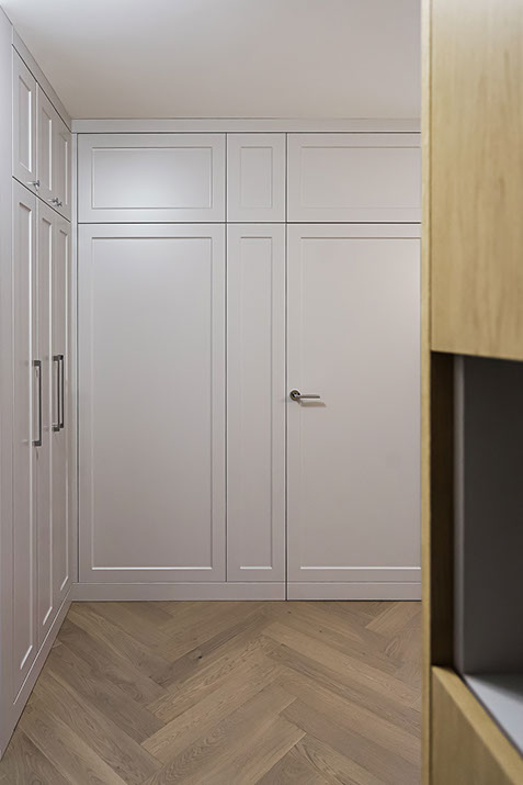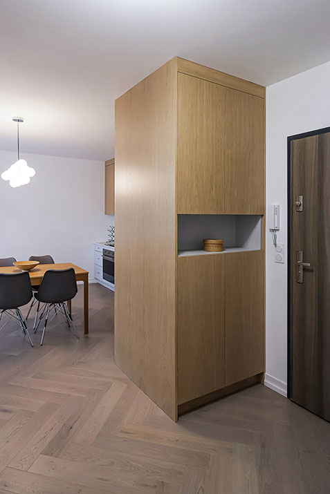 za frontem szafy, przez co uzyskano jednolitą powierzchnię. Po drugiej stronie drzwi powstała wygodna szafa.