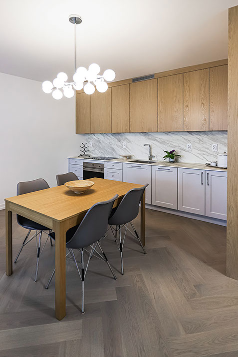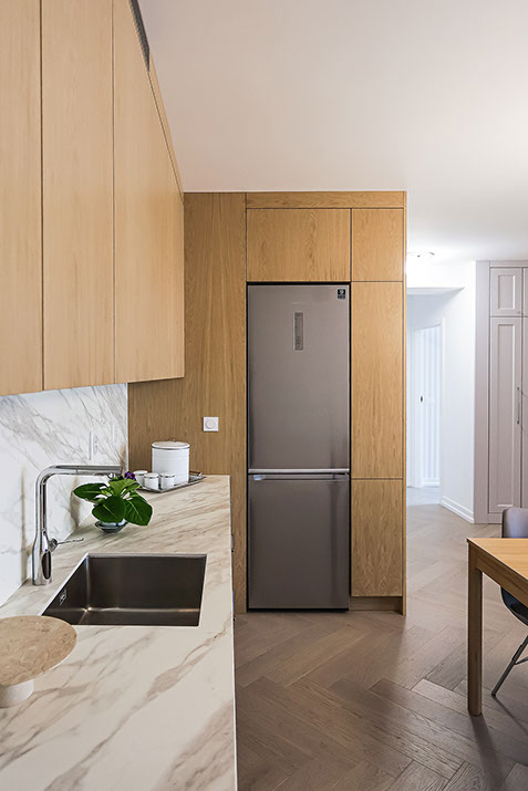 na przechowywanie. Aby osiągnąć zamierzone efekty zastosowano niecodzienne rozwiązania. Zabudowa lodówki jest jednocześnie szafą