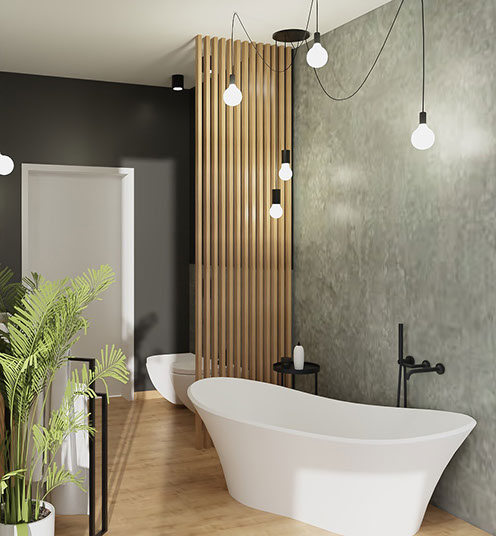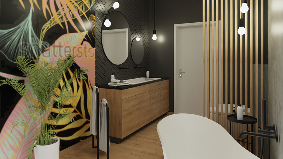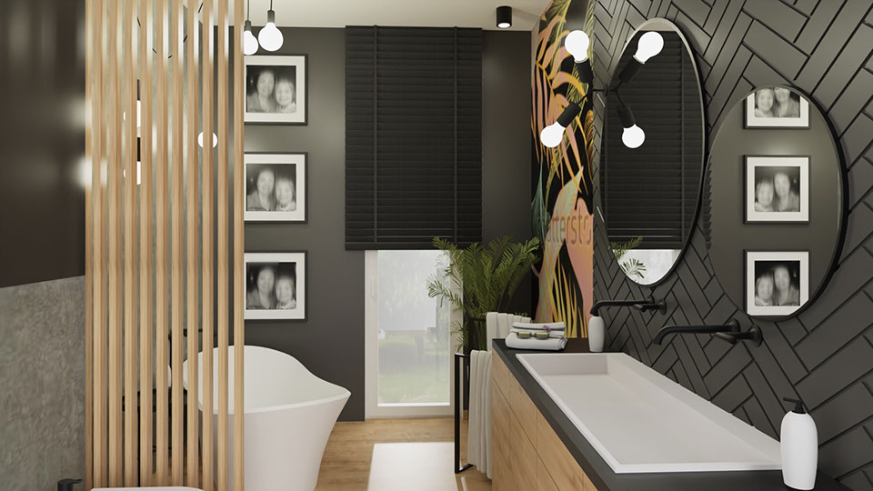 wnętrza z przeznaczeniem dla żeńskiej części rodziny. Wykorzystana została wcześniej zakupiona wanna wolnostojąca oraz lamele. Powstała loftowa przestrzeń, z mocnym akcentem w postaci kolorowej fototapety.