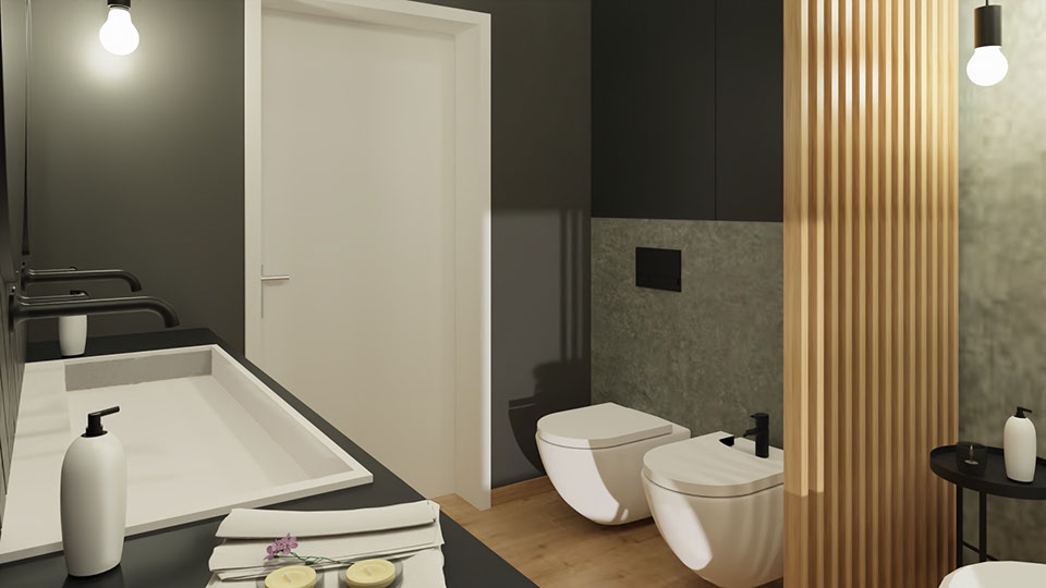 z przeznaczeniem dla żeńskiej części rodziny. Wykorzystana została wcześniej zakupiona wanna wolnostojąca oraz lamele. Powstała loftowa przestrzeń, z mocnym akcentem w postaci kolorowej fototapety.