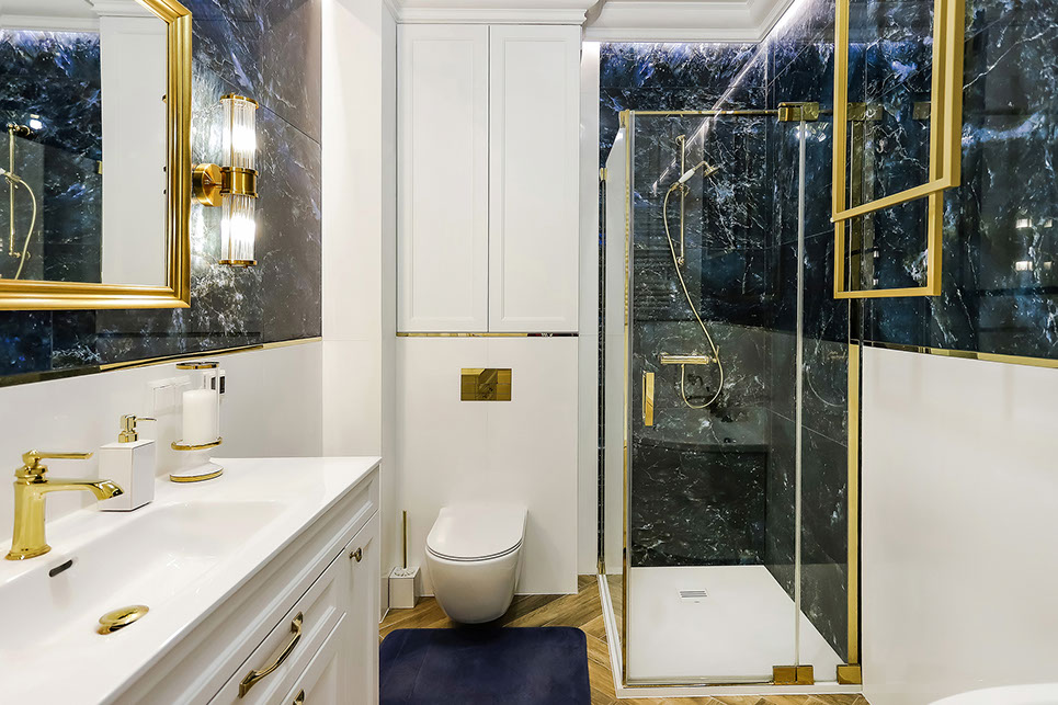 Aby uzyskać większą przestrzeń w łazience, pralka, suszarka oraz brudniak zostały schowane